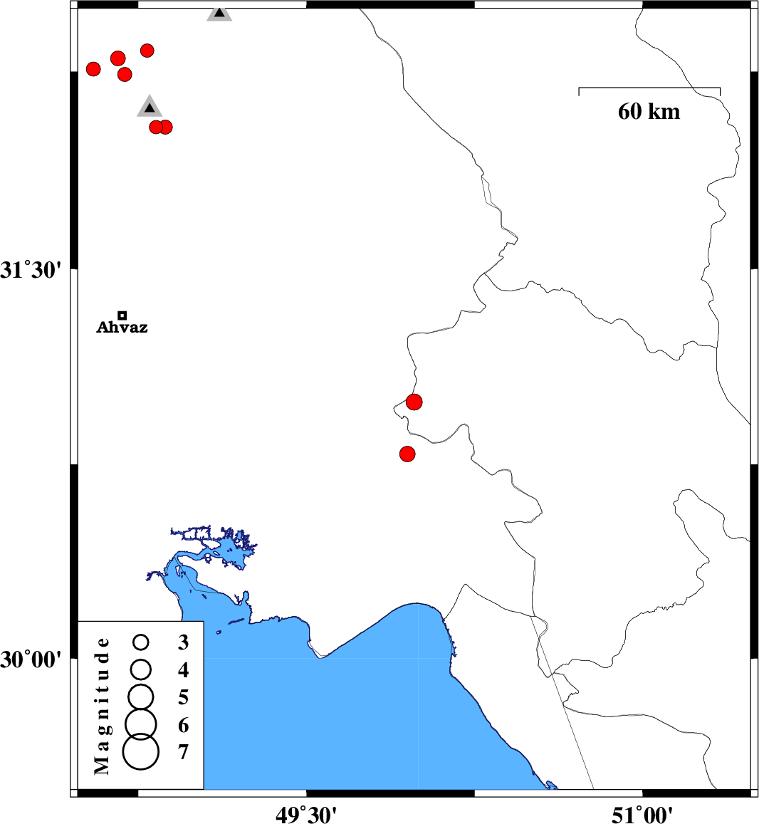 | 2010/04/20 | 11:39:43.2 | 16:09:43.2 | 30.79 | 49.95 | 14 | ML:3.1 | Khoozestan Province, 24 km East of Omidiyeh |