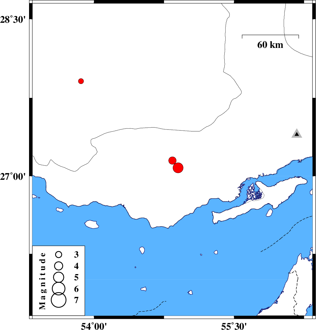 | 2010/04/27 | 22:58:00.7 | 03:28:00.7 | 27.08 | 54.9 | 32 | ML:5 | Hormozgan Province, 62 km North of Bandar-e lengeh | ||