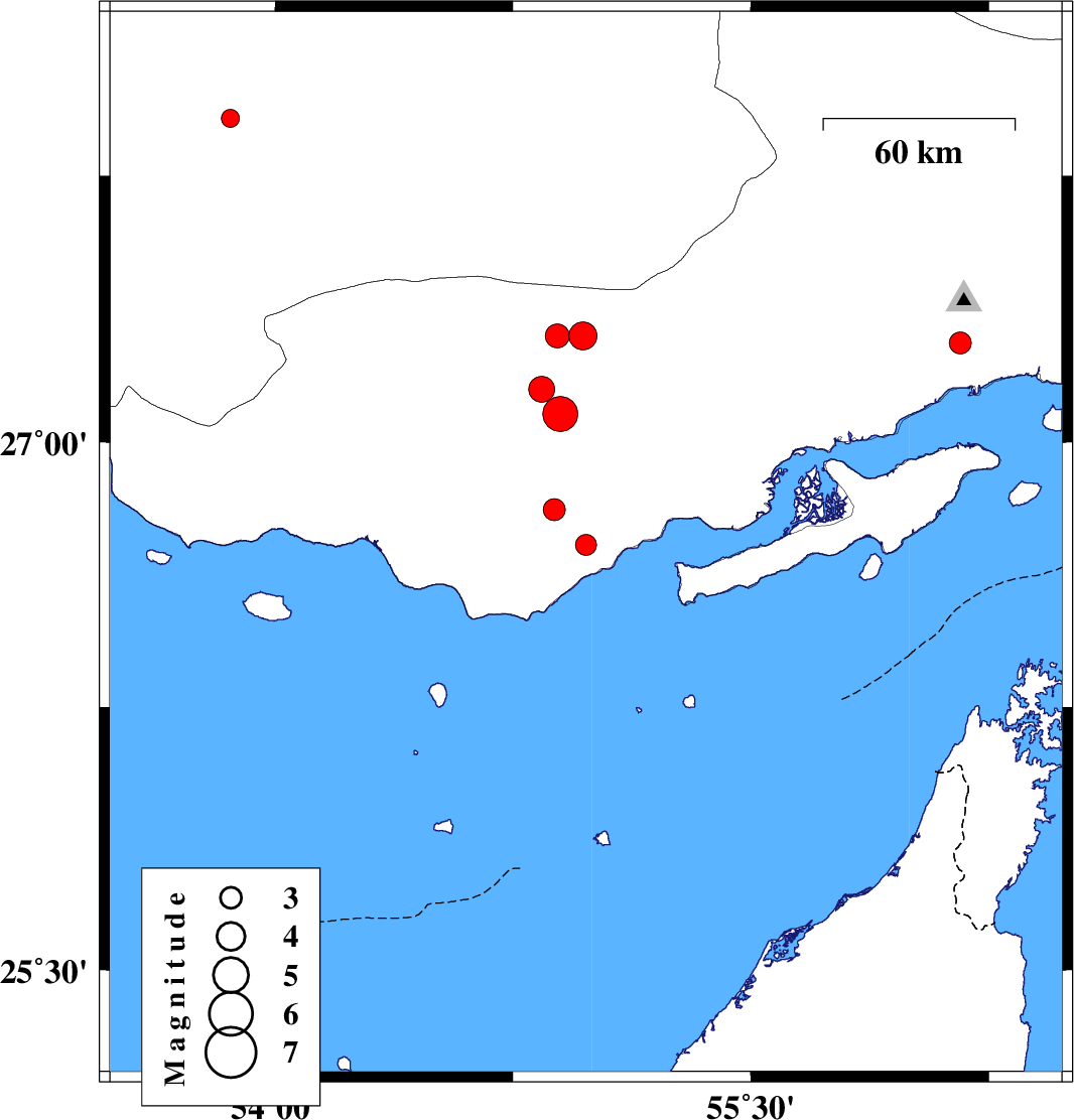 | 2010/04/28 | 09:45:24.3 | 14:15:24.3 | 26.71 | 54.98 | 46 | ML:3 | Hormozgan Province, 24 km North-East of Bandar-e lengeh | ||