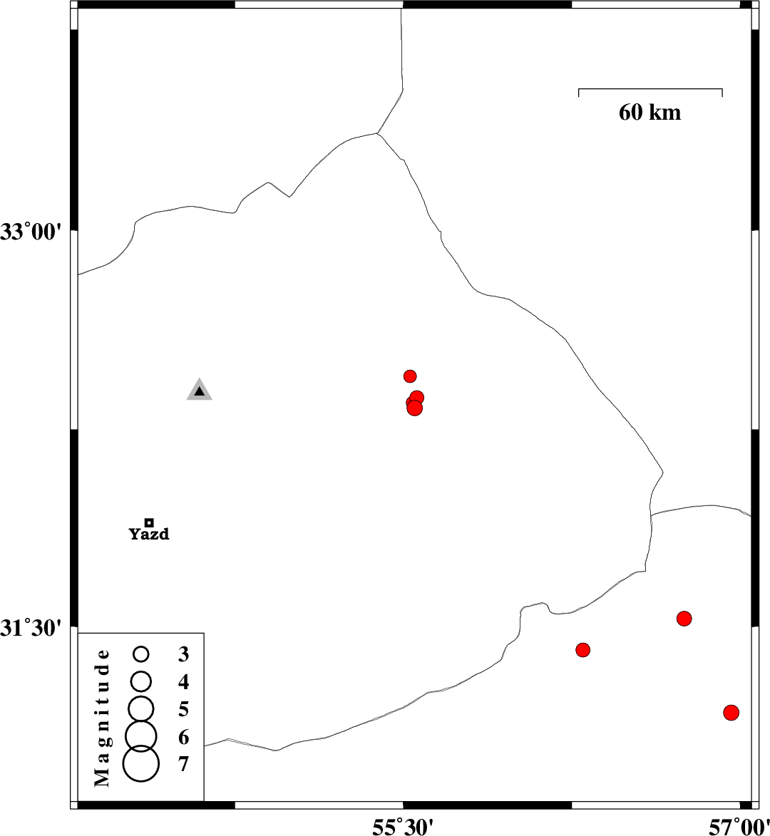 | 2010/04/16 | 12:19:43.2 | 16:49:43.2 | 32.37 | 55.56 | 46 | ML:2.8 | Yazd Province, 87 km North-East of Bafq | ||