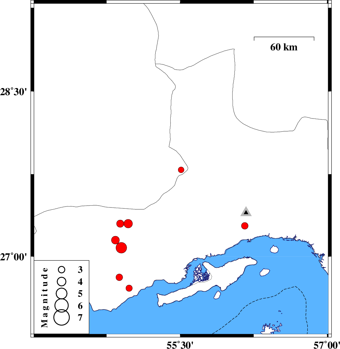 | 2010/04/27 | 22:58:00.7 | 03:28:00.7 | 27.08 | 54.9 | 32 | ML:5 | Hormozgan Province, 62 km North of Bandar-e lengeh |