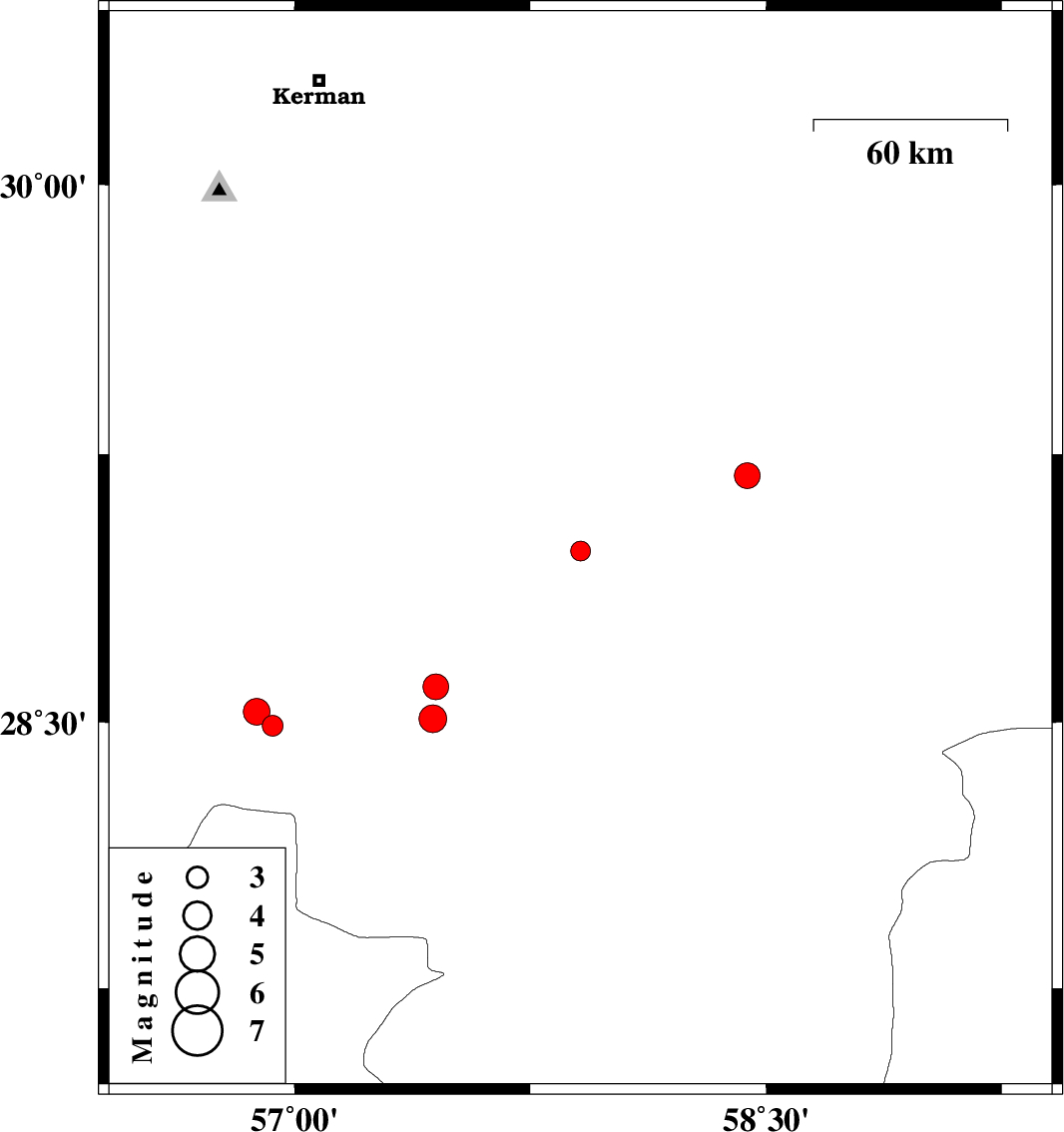 | 2010/05/03 | 06:16:31.8 | 10:46:31.8 | 28.98 | 57.91 | 14 | ML:2.8 | Kerman Province, 39 km North-East of Jiroft | ||