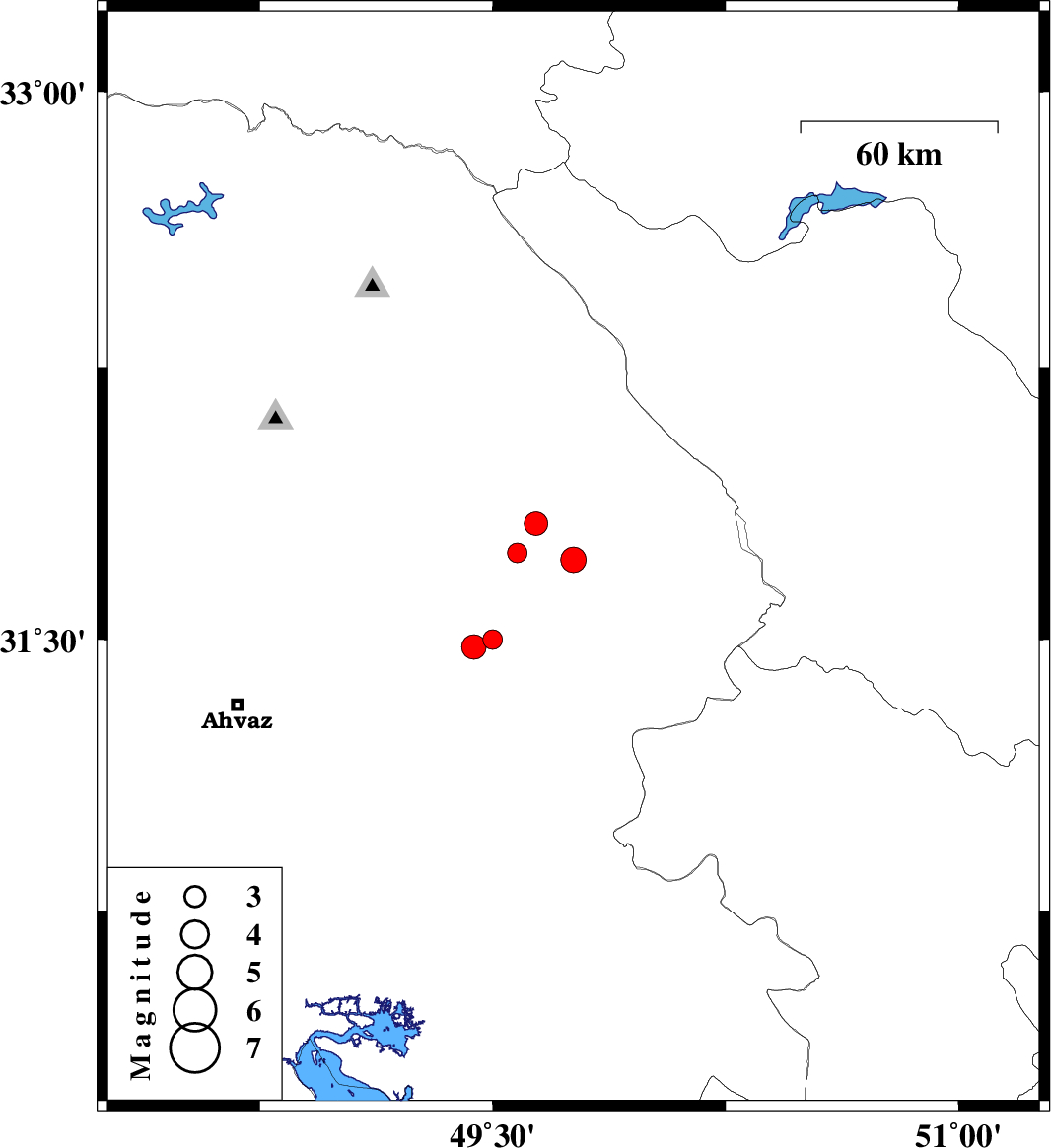 | 2010/05/07 | 09:44:03.6 | 14:14:03.6 | 31.82 | 49.64 | 41 | ML:3.4 | Khoozestan Province, 22 km West of Izeh | ||