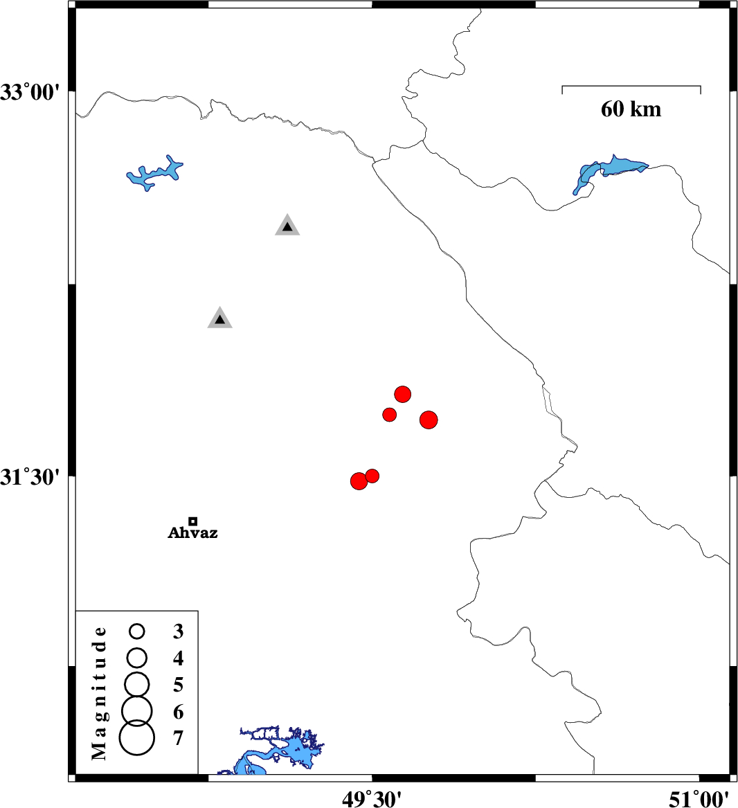 | 2010/05/07 | 09:44:03.6 | 14:14:03.6 | 31.82 | 49.64 | 41 | ML:3.4 | Khoozestan Province, 22 km West of Izeh | ||