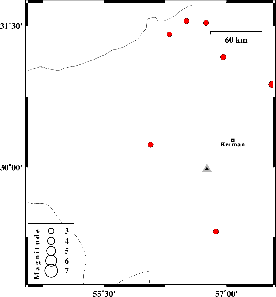 | 2010/05/07 | 19:32:30.2 | 00:02:30.2 | 30.24 | 56.07 | 18 | ML:3 | Kerman Province, 19 km South of Rafsanjan | ||