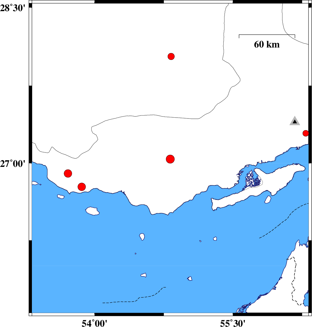 2010/05/06 | 15:07:11.3 | 19:37:11.3 | 26.77 | 53.86 | 16 | ML:3.8 | Hormozgan Province, 69 km South-West of Bastak | ||