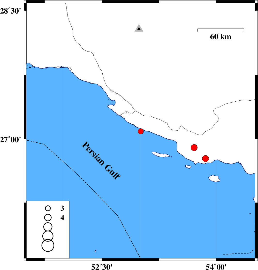 | 2010/05/10 | 03:41:22.4 | 08:11:22.4 | 27.09 | 53.01 | 15 | ML:3.3 | Persian Gulf, 31 km South-West of Lamerd | ||