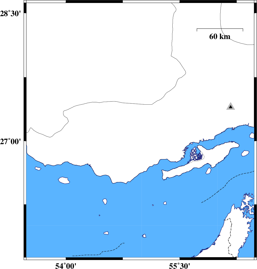| 2010/05/05 | 16:10:07.4 | 20:40:07.4 | 26.9 | 53.71 | 43 | ML:3.8 | Hormozgan Province, 72 km South-West of Bastak |