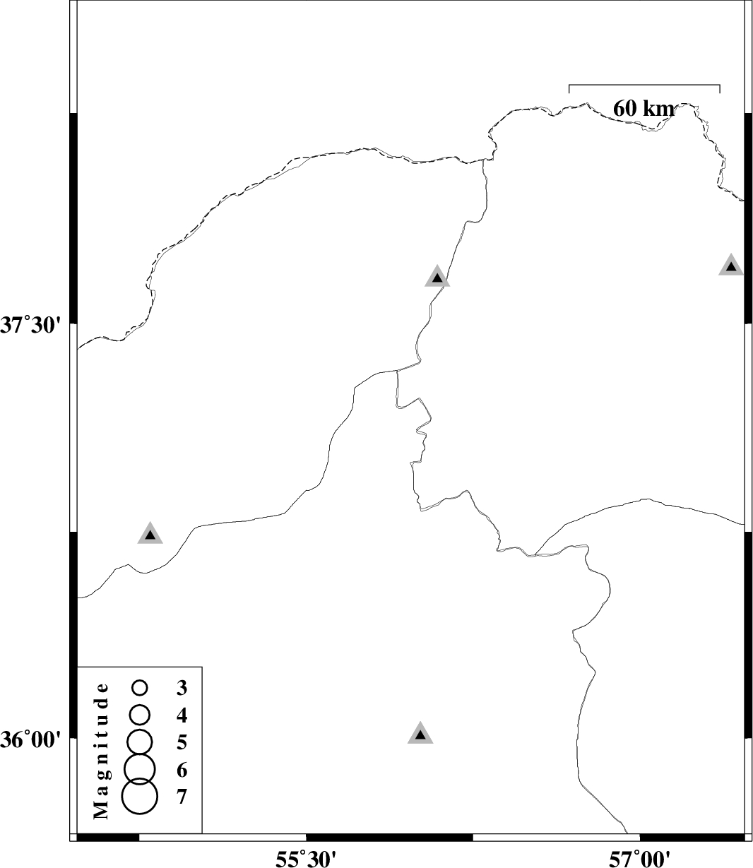 | 2010/05/12 | 21:11:29.3 | 01:41:29.3 | 37.15 | 55.97 | 6 | ML:3.6 | Semnan Province, 44 km North-West of Jajarm |