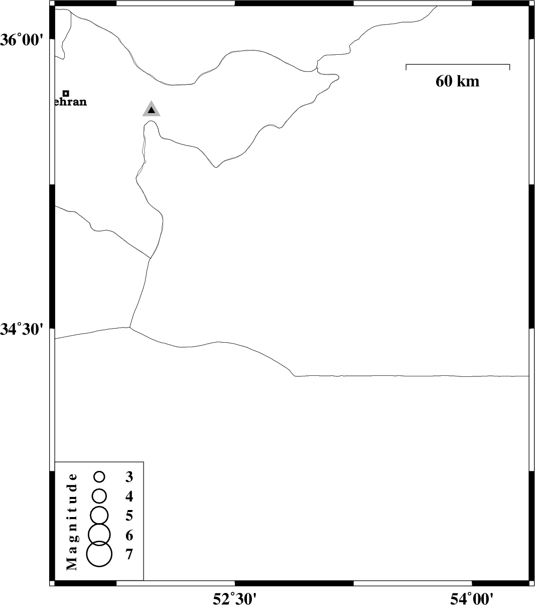| 2010/05/13 | 19:08:24.9 | 23:38:24.9 | 34.67 | 52.86 | 6 | ML:2.6 | Semnan Province, 77 km South-East of Garmsar |