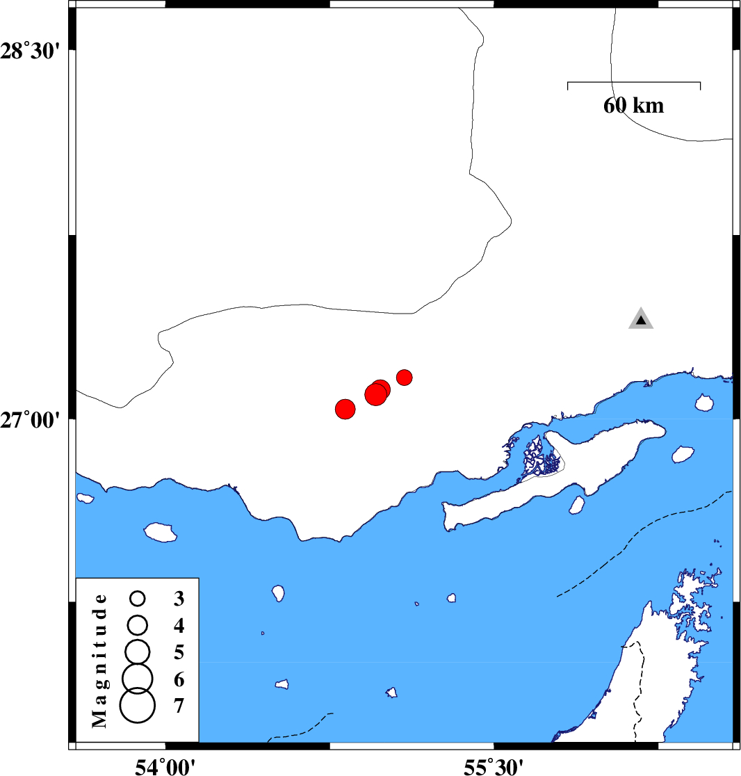 2010/05/14 | 09:33:18.7 | 14:03:18.7 | 27.1 | 54.96 | 41 | ML:4.5 | Hormozgan Province, 65 km North-East of Bandar-e lengeh | ||