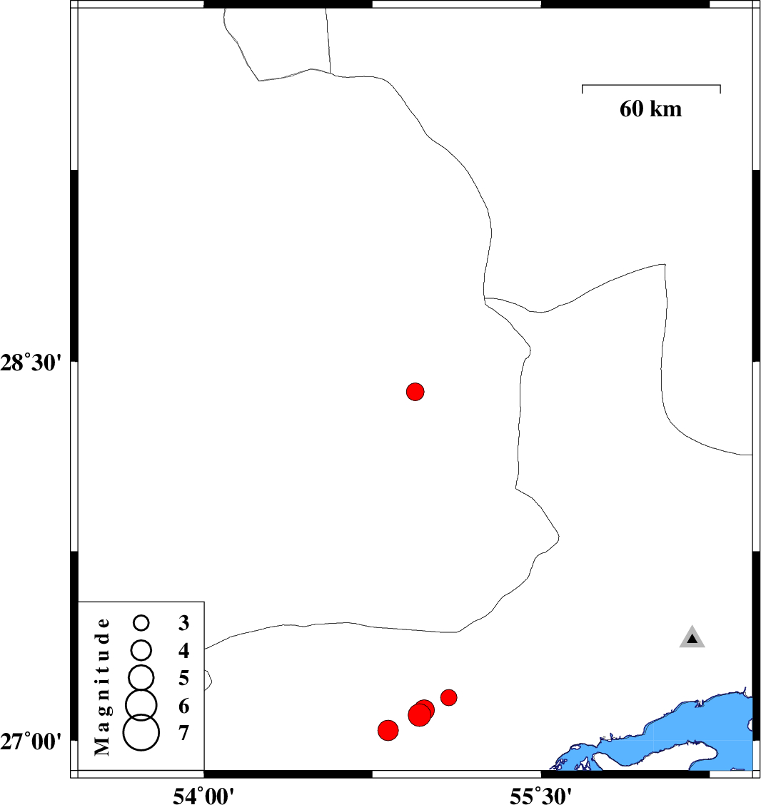 2010/05/14 | 09:33:18.7 | 14:03:18.7 | 27.1 | 54.96 | 41 | ML:4.5 | Hormozgan Province, 65 km North-East of Bandar-e lengeh | ||