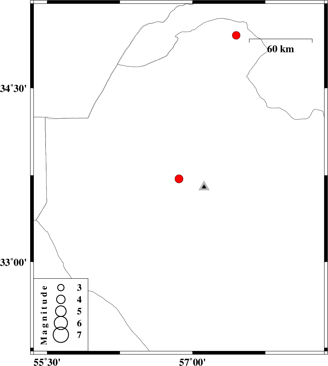 | 2010/05/18 | 03:59:36.6 | 08:29:36.6 | 33.72 | 56.86 | 9 | ML:3.8 | Yazd Province, 14 km North of Tabas | ||