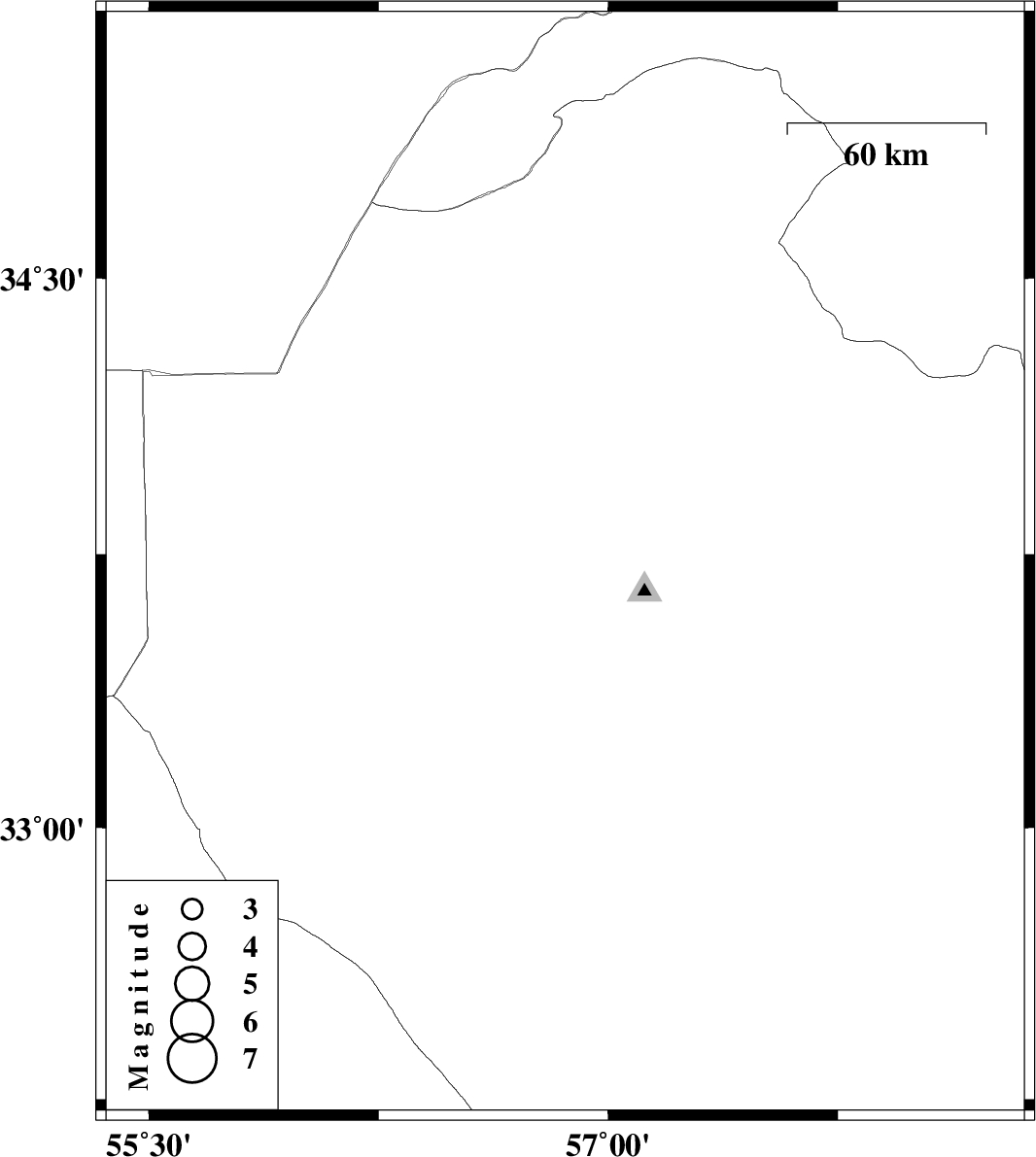 | 2010/05/18 | 03:59:36.6 | 08:29:36.6 | 33.72 | 56.86 | 9 | ML:3.8 | Yazd Province, 14 km North of Tabas |