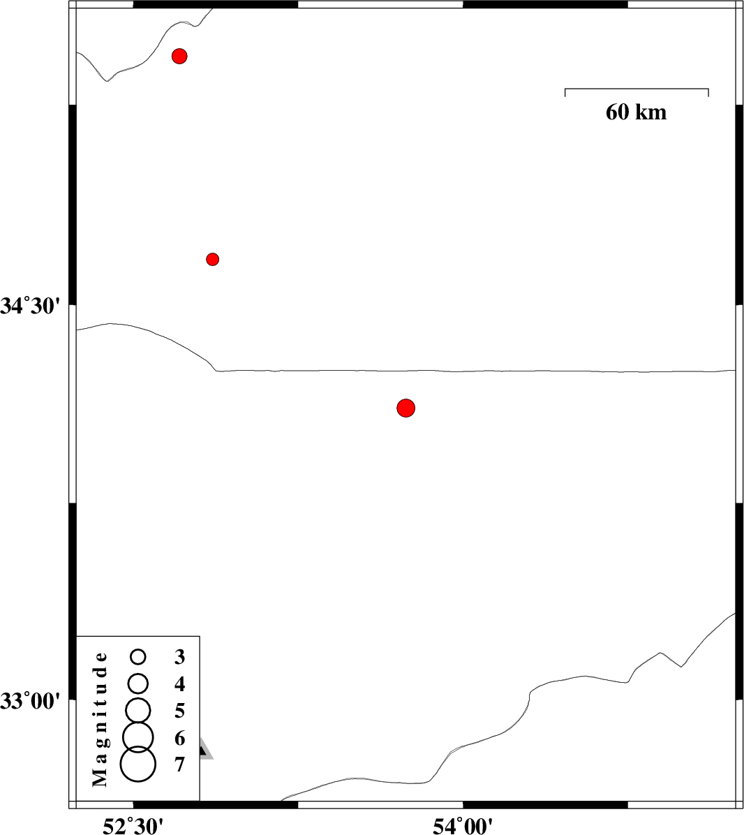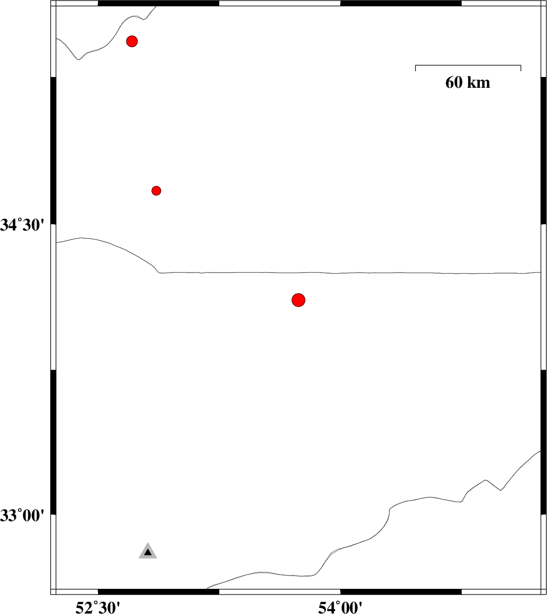 | 2010/05/18 | 09:14:11.4 | 13:44:11.4 | 34.11 | 53.74 | 14 | ML:3.7 | Esfahan Province, 165 km South-East of Semnan | ||