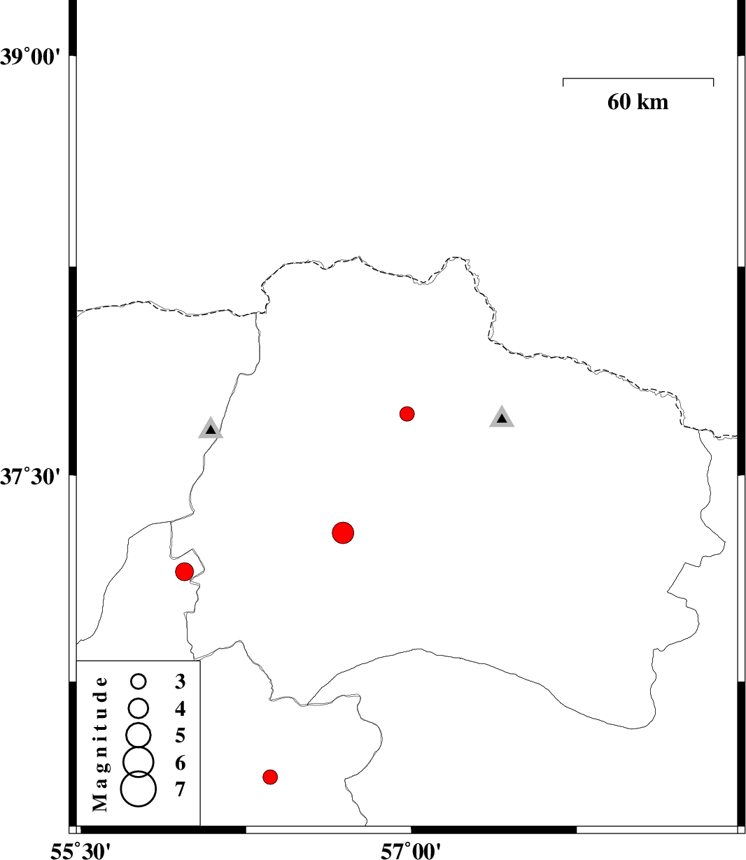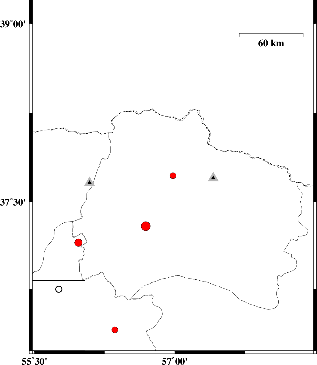| 2010/05/12 | 21:11:29.3 | 01:41:29.3 | 37.15 | 55.97 | 6 | ML:3.6 | Semnan Province, 44 km North-West of Jajarm | ||