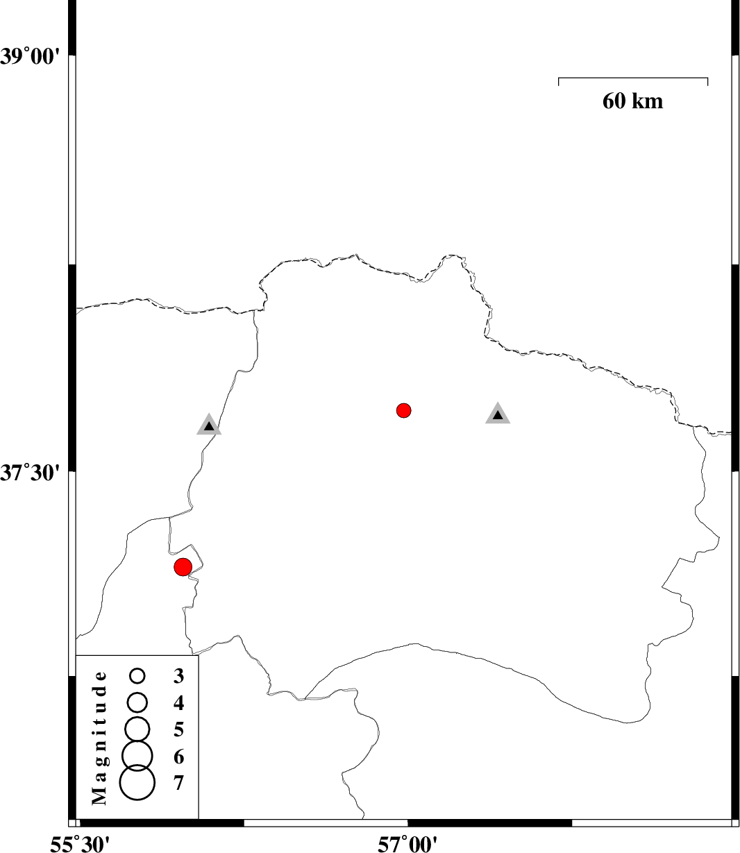 | 2010/05/12 | 21:11:29.3 | 01:41:29.3 | 37.15 | 55.97 | 6 | ML:3.6 | Semnan Province, 44 km North-West of Jajarm |