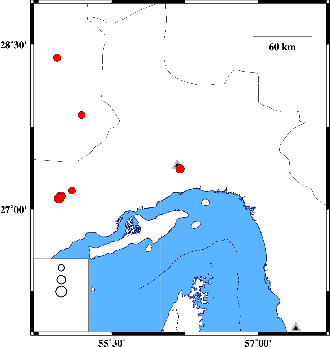 | 2010/05/19 | 19:41:46.5 | 00:11:46.5 | 27.37 | 56.2 | 27 | ML:3.9 | Hormozgan Province, 22 km North of Bandar-e abbas | ||