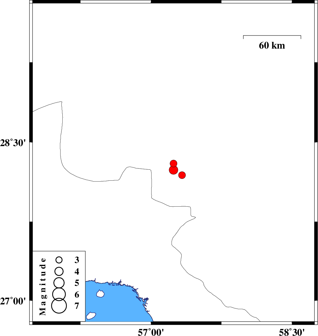 | 2010/05/22 | 14:45:31.7 | 19:15:31.7 | 28.3 | 57.24 | 15 | ML:3.4 | Kerman Province, 59 km North-West of Kahnuj | ||