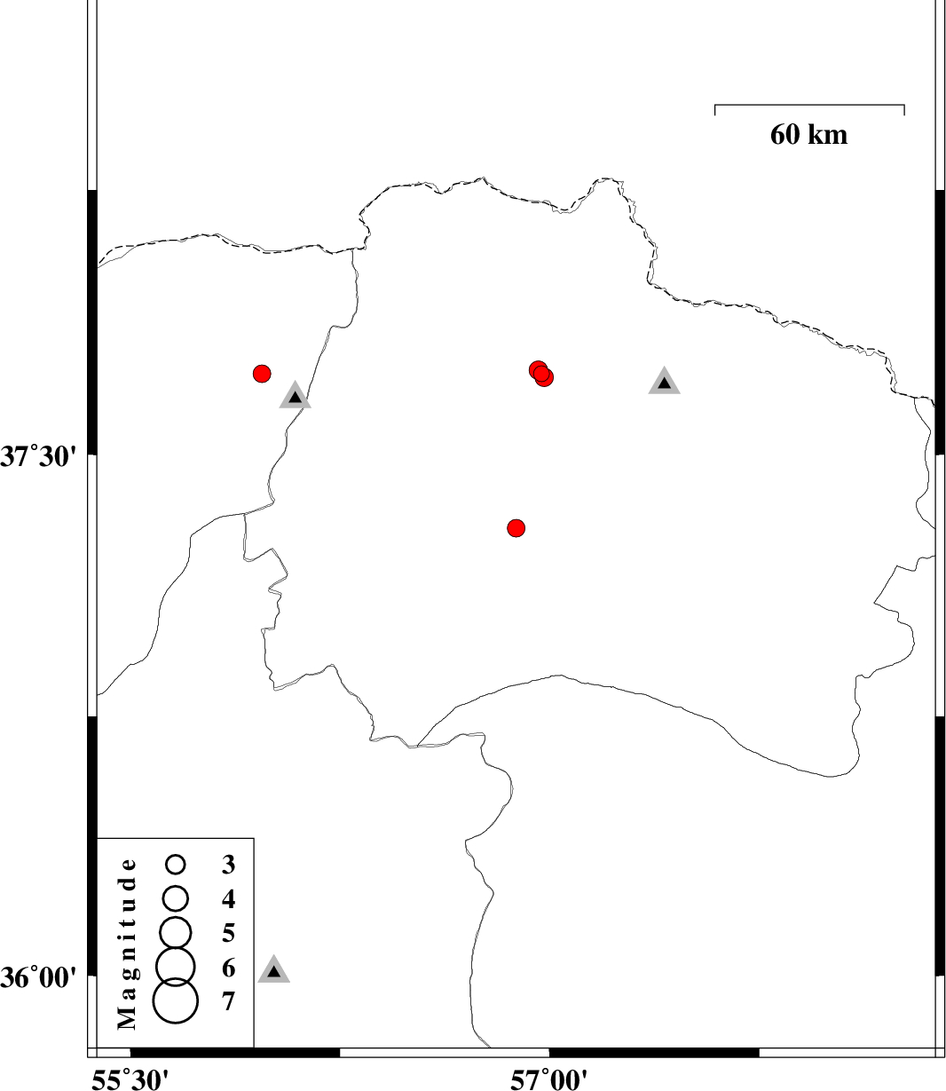 | 2010/05/20 | 11:09:00.9 | 15:39:00.9 | 37.73 | 55.97 | 12 | ML:2.8 | Golestan Province, 57 km North-East of Kalaleh | ||