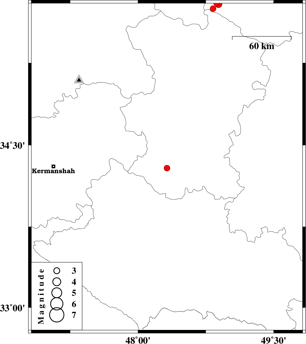 | 2010/05/23 | 06:47:51.2 | 11:17:51.2 | 34.29 | 48.32 | 15 | ML:2.9 | Hamedan Province, 12 km North of Nahavand | ||
