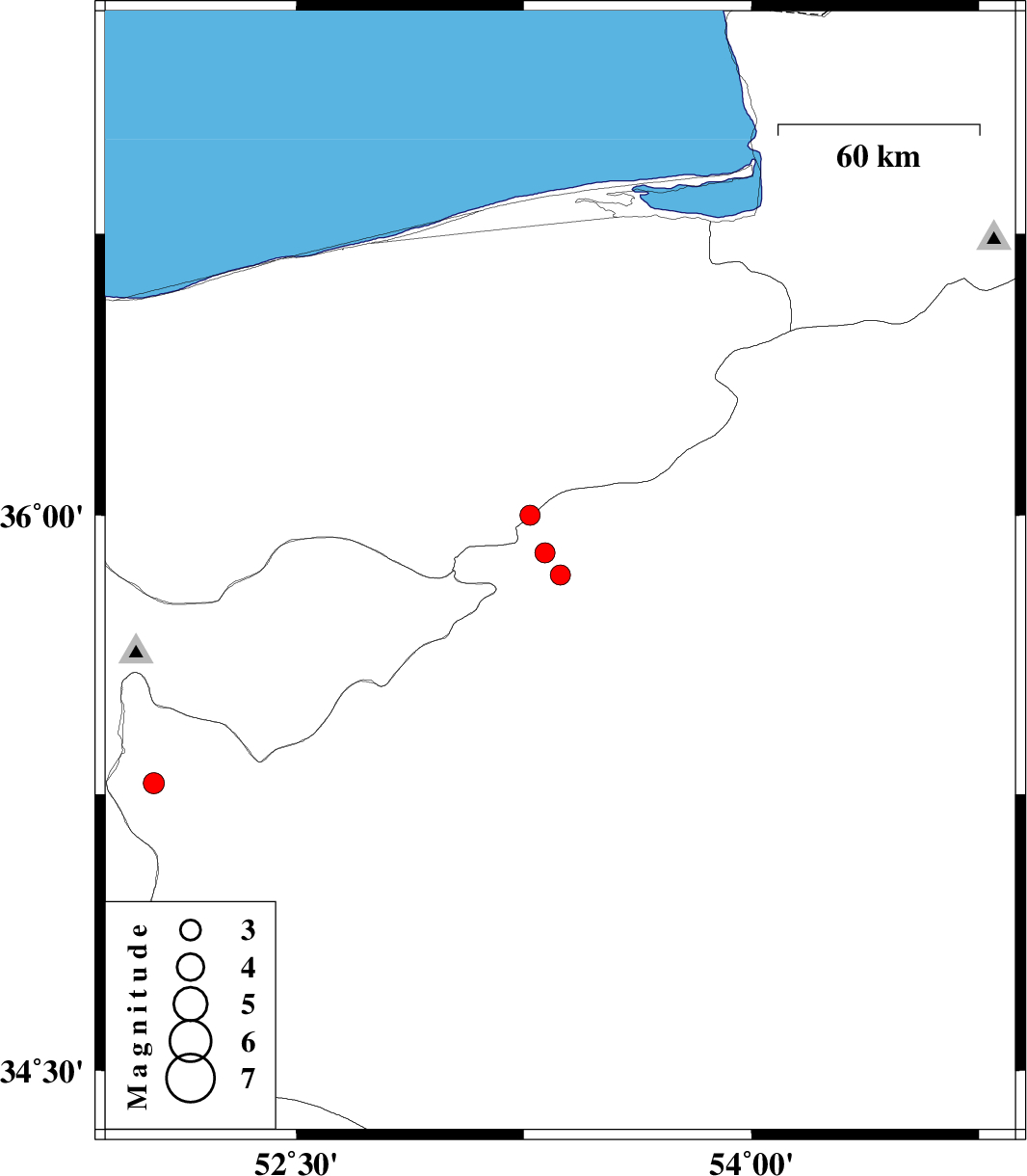 | 2010/05/19 | 00:59:55.7 | 05:29:55.7 | 35.28 | 52.03 | 35 | ML:3.1 | Semnan Province, 29 km West of Garmsar |
