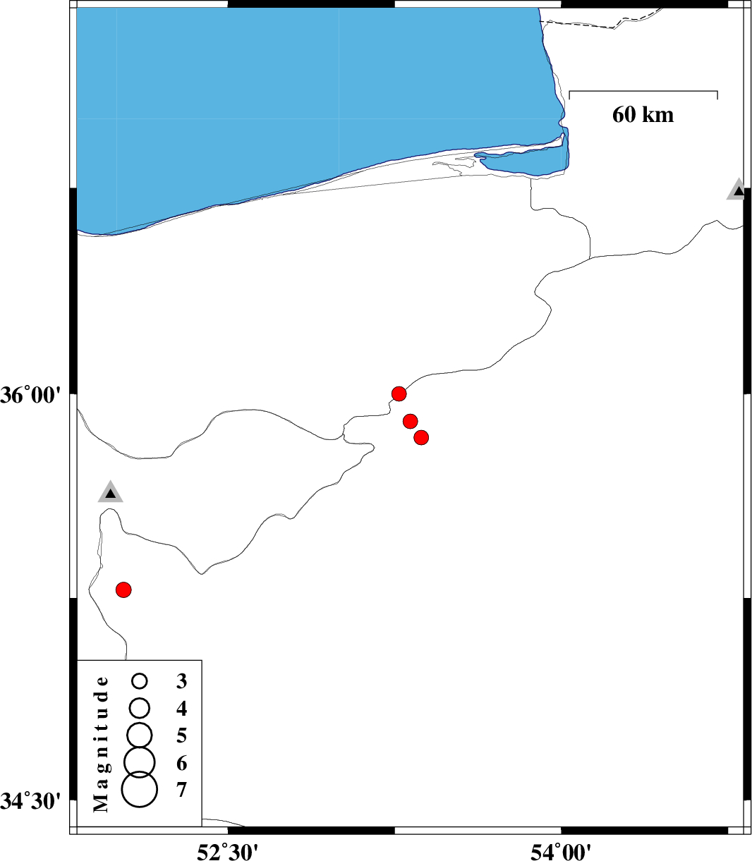| 2010/05/19 | 00:59:55.7 | 05:29:55.7 | 35.28 | 52.03 | 35 | ML:3.1 | Semnan Province, 29 km West of Garmsar |