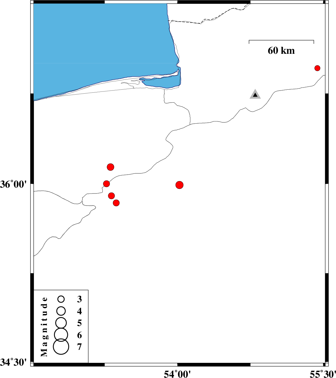 | 2010/05/24 | 10:28:01.8 | 14:58:01.8 | 35.84 | 53.37 | 14 | ML:3 | Semnan Province, 31 km North of Semnan |