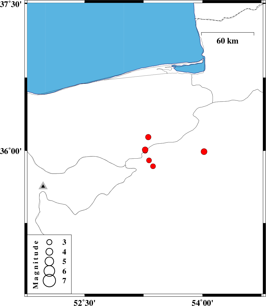 | 2010/05/27 | 04:02:11.3 | 08:32:11.3 | 36.01 | 53.27 | 7 | ML:3.4 | Mazandaran Province, 22 km South-East of Pol-E-Sefid | ||