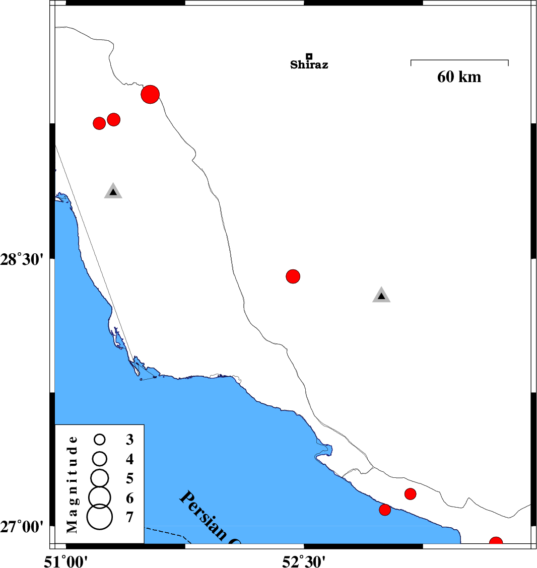 | 2010/05/14 | 18:49:54.8 | 23:19:54.8 | 29.41 | 51.53 | 15 | ML:5.2 | Bushehr Province, 26 km South-West of Kazerun | ||