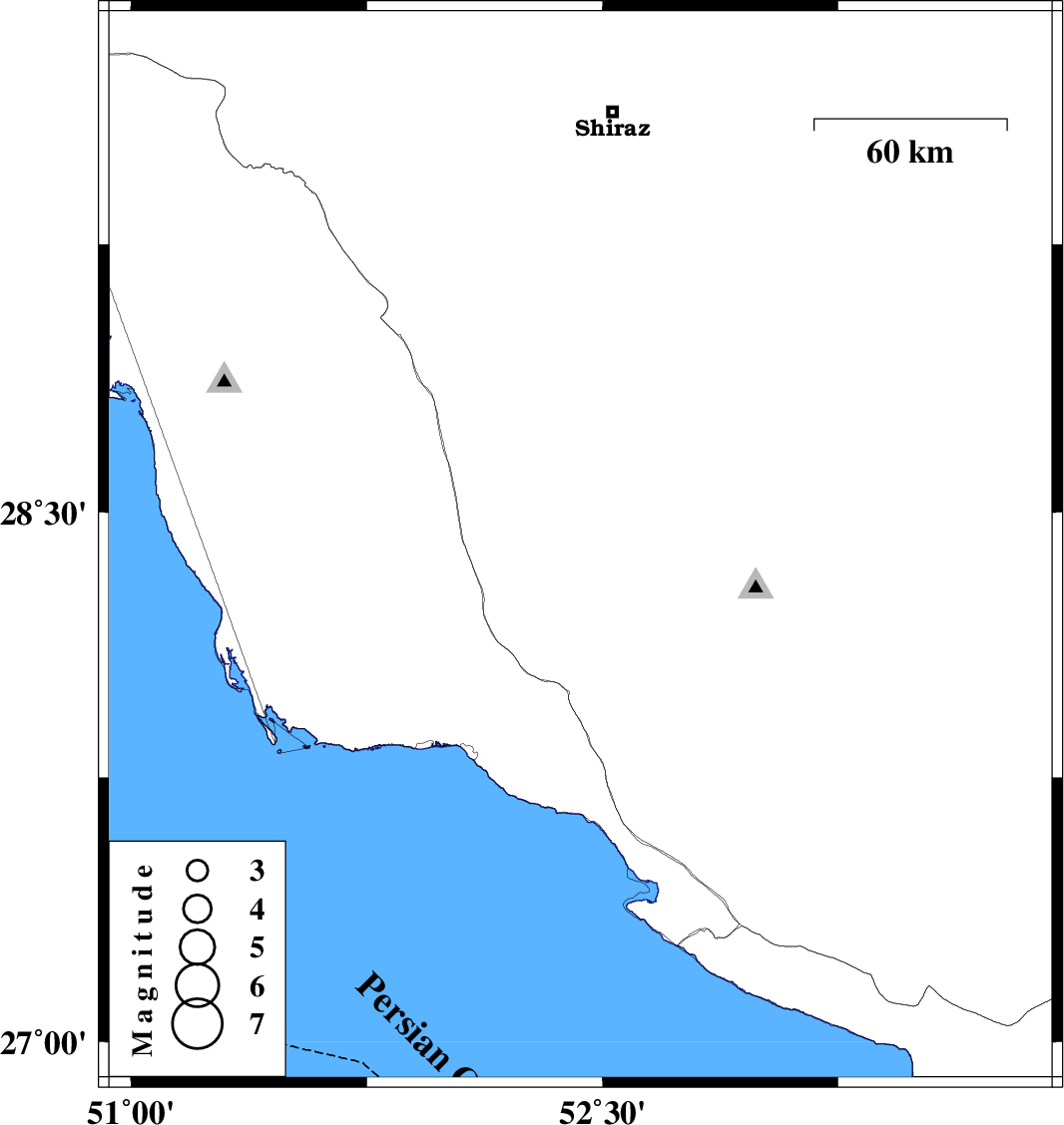 | 2010/05/28 | 07:23:40.1 | 11:53:40.1 | 28.4 | 52.43 | 14 | ML:3.9 | Fars Province, 50 km South-West of Firuz Abad |