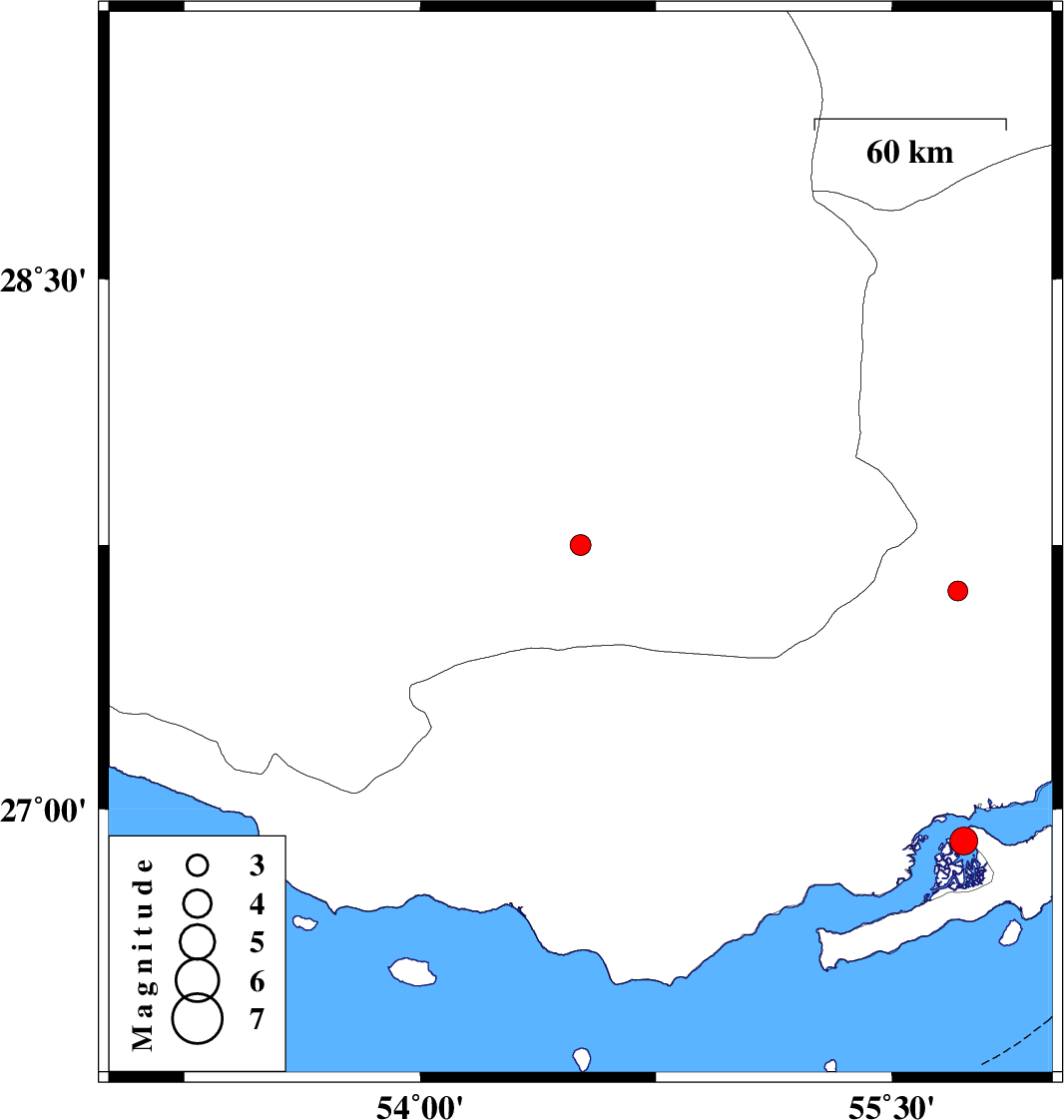 2010/05/28 | 11:16:55.1 | 15:46:55.1 | 26.91 | 55.73 | 6 | ML:4 | Persian Gulf, 53 km West of Qeshm | ||