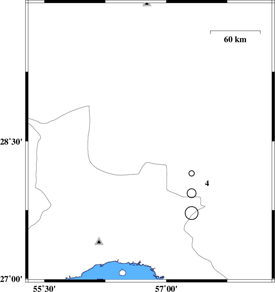 | 2010/06/06 | 17:49:00.2 | 22:19:00.2 | 28.49 | 56.8 | 46 | ML:4.3 | Kerman Province, 85 km South-East of Baft |