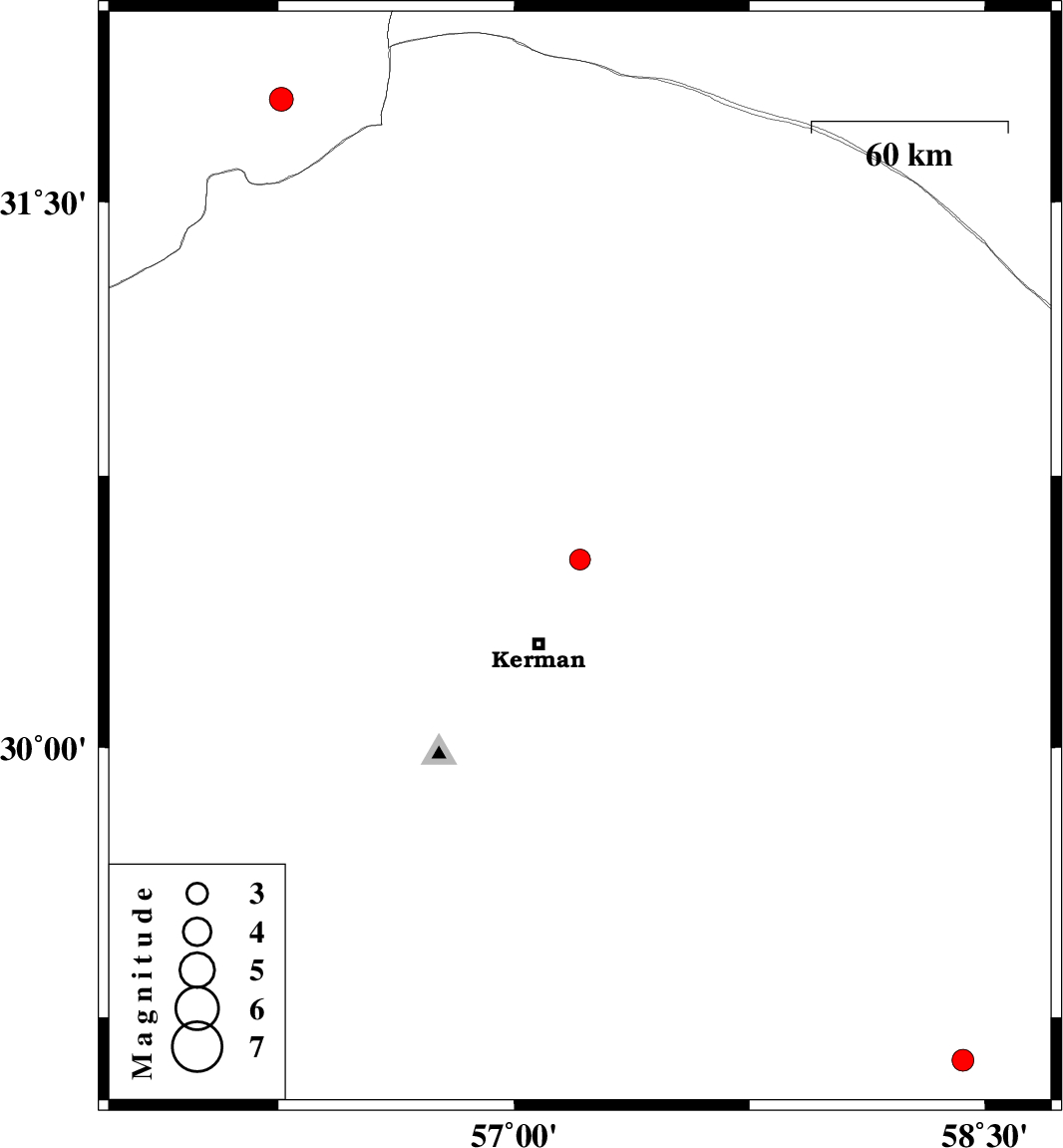 2010/06/01 | 05:41:35.4 | 10:11:35.4 | 30.52 | 57.21 | 10 | ML:3 | Kerman Province, 29 km North-East of Kerman |