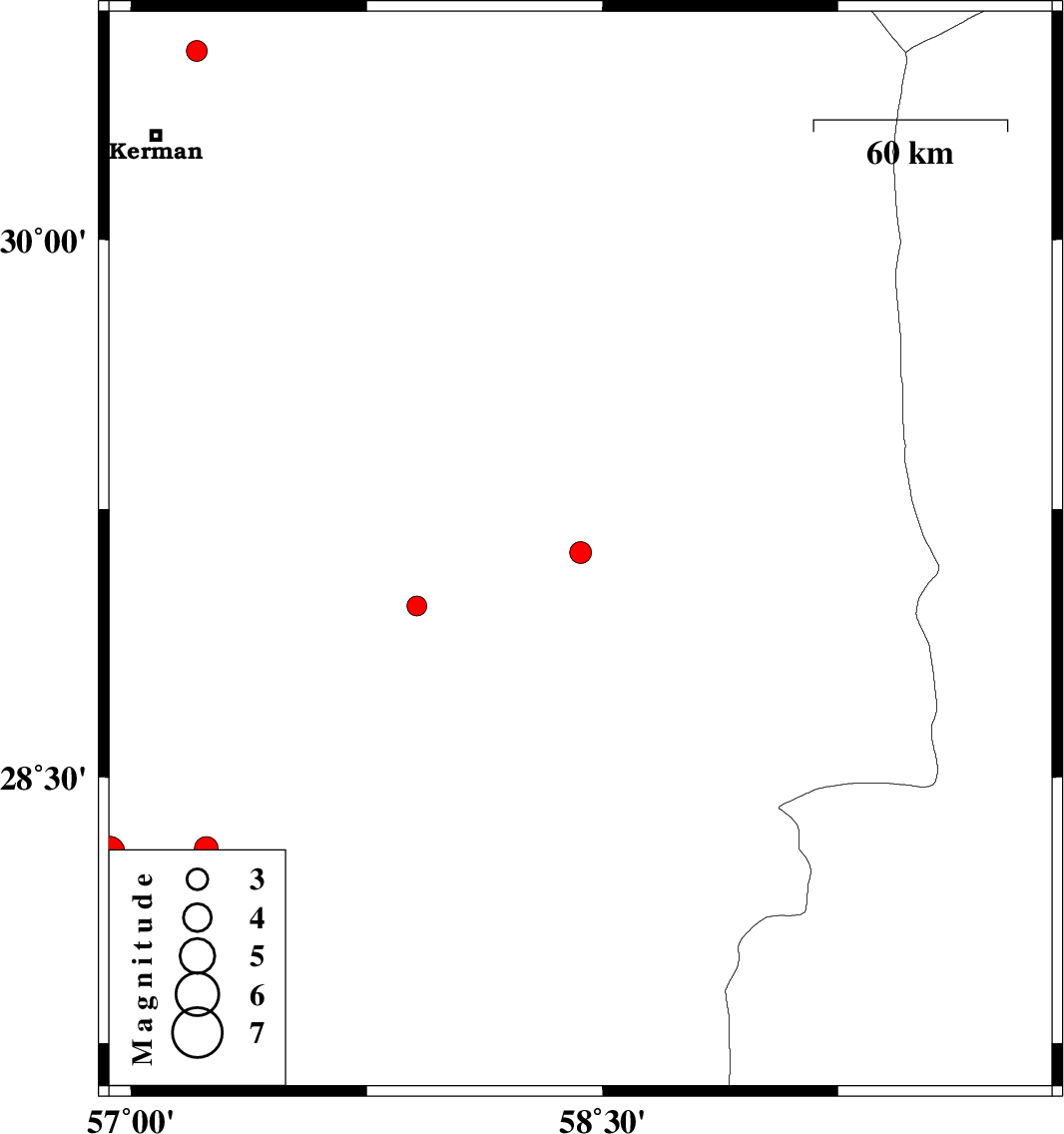 | 2010/05/22 | 14:45:31.7 | 19:15:31.7 | 28.3 | 57.24 | 15 | ML:3.4 | Kerman Province, 59 km North-West of Kahnuj | ||