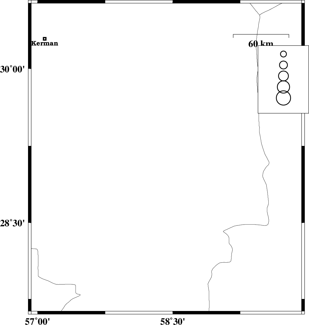 2010/06/01 | 23:37:27.3 | 04:07:27.3 | 29.13 | 58.43 | 14 | ML:3.1 | Kerman Province, 7 km Bam | ||