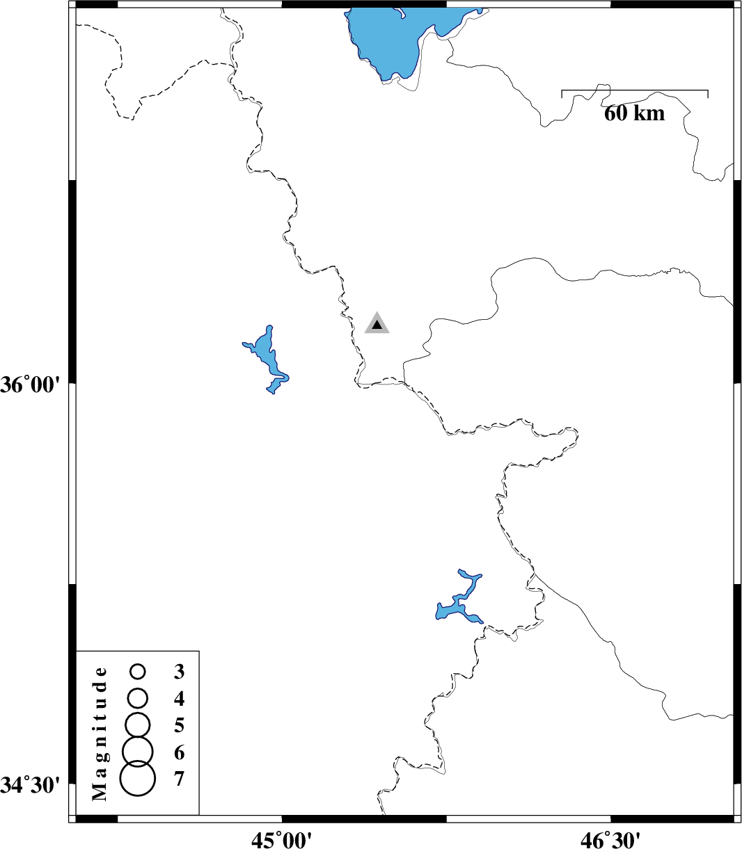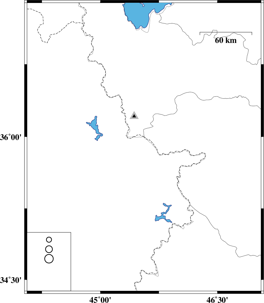 | 2010/06/05 | 12:47:05.0 | 17:17:05.0 | 35.88 | 45.56 | 14 | ML:3.4 | Iraq, 32 km South of Sardasht |