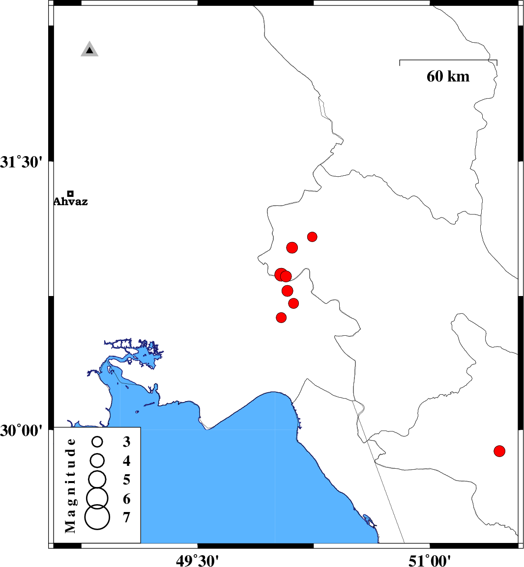 | 2010/06/07 | 02:28:10.2 | 06:58:10.2 | 30.87 | 50.04 | 26 | ML:3.8 | Kohkiluieh va boyerahmad Province, 34 km North-East of Omidiyeh | ||