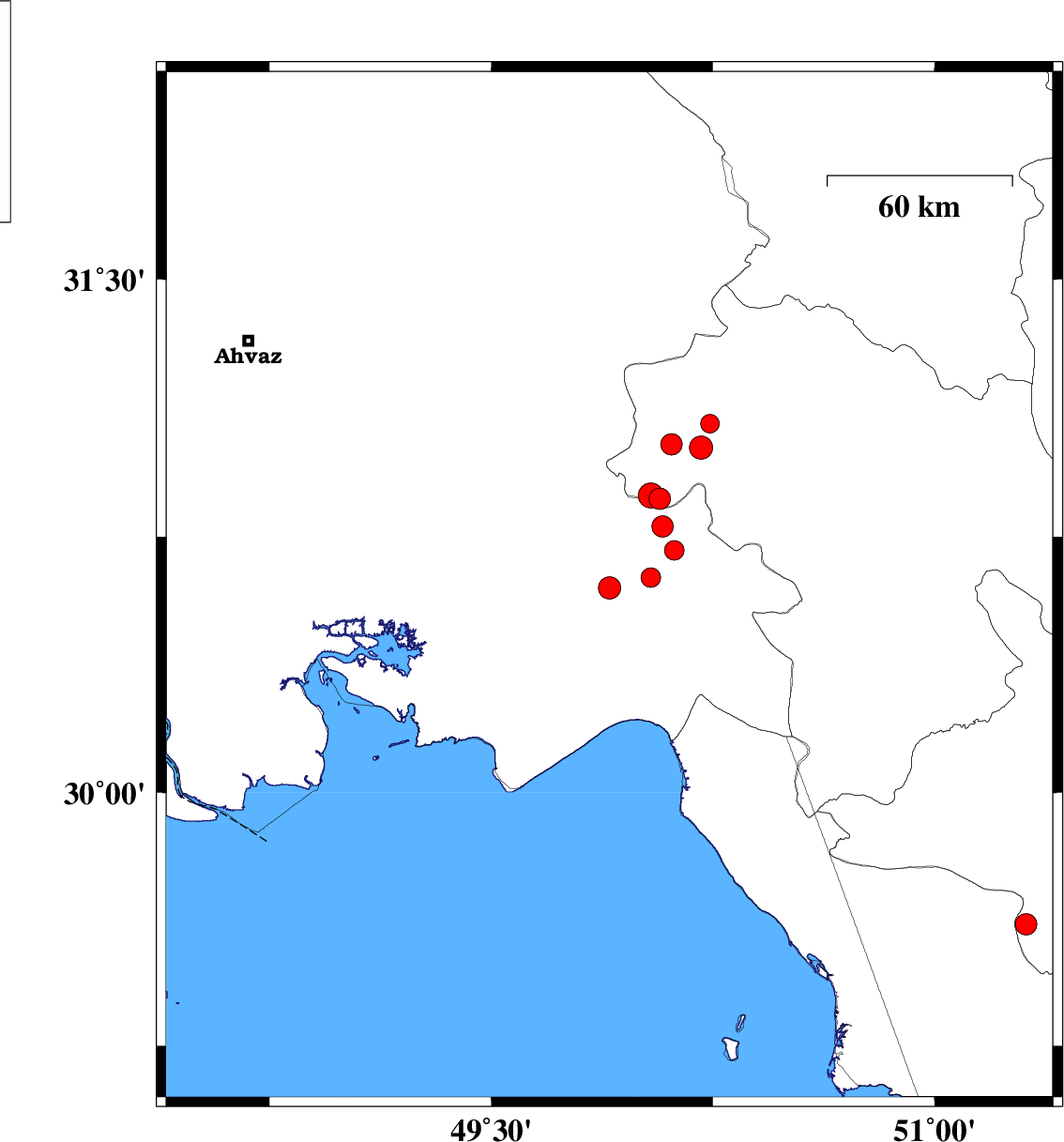 2010/06/08 | 16:04:58.7 | 20:34:58.7 | 30.6 | 49.9 | 15 | ML:3.4 | Khoozestan Province, 33 km West of Behbahan | ||
