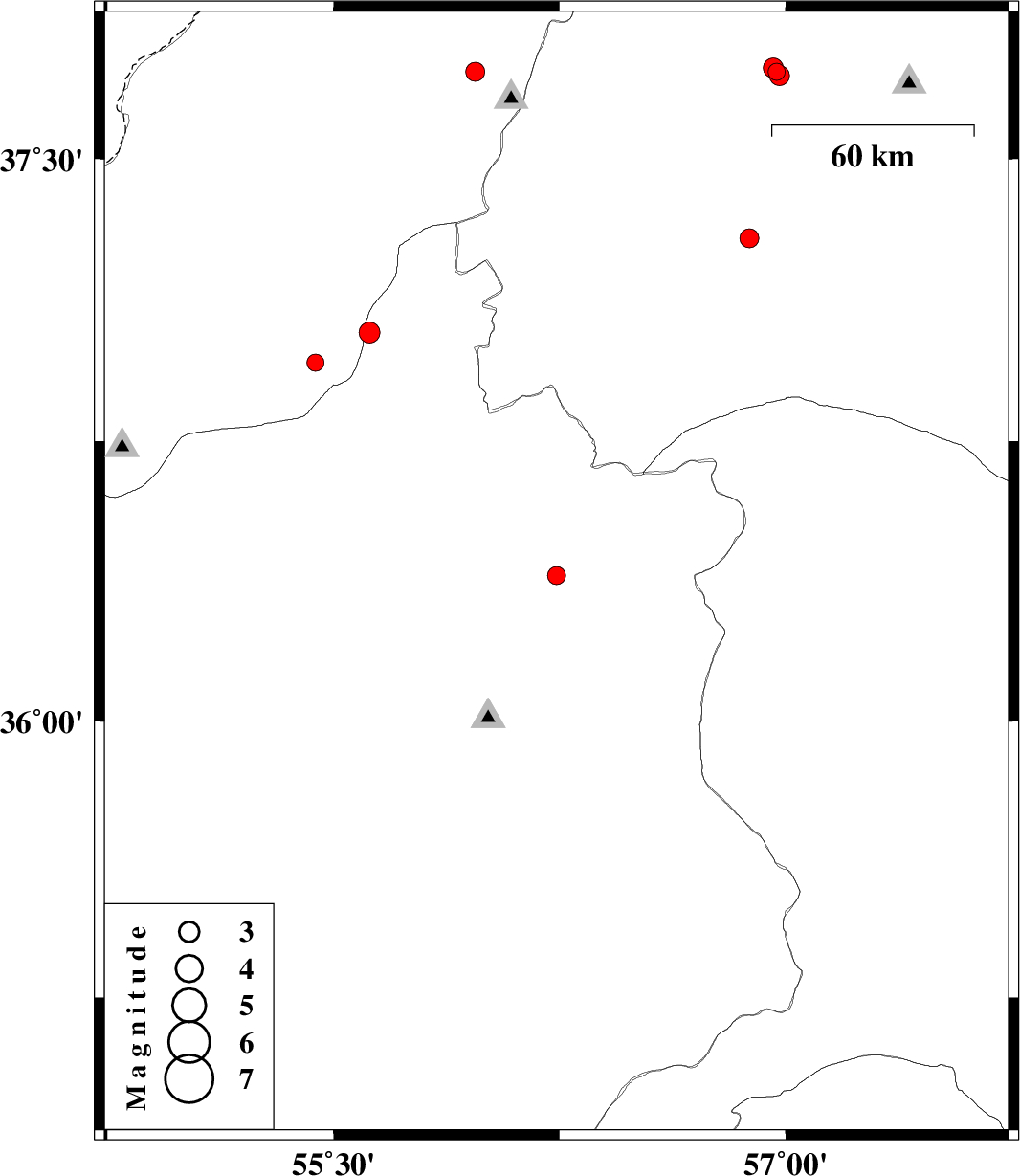 | 2010/05/20 | 11:09:00.9 | 15:39:00.9 | 37.73 | 55.97 | 12 | ML:2.8 | Golestan Province, 57 km North-East of Kalaleh | ||