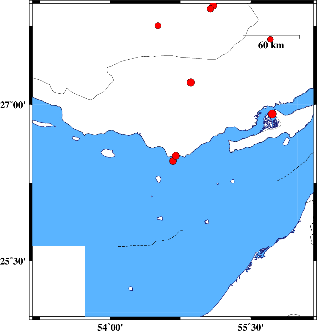 2010/05/28 | 11:16:55.1 | 15:46:55.1 | 26.91 | 55.73 | 6 | ML:4 | Persian Gulf, 53 km West of Qeshm | ||