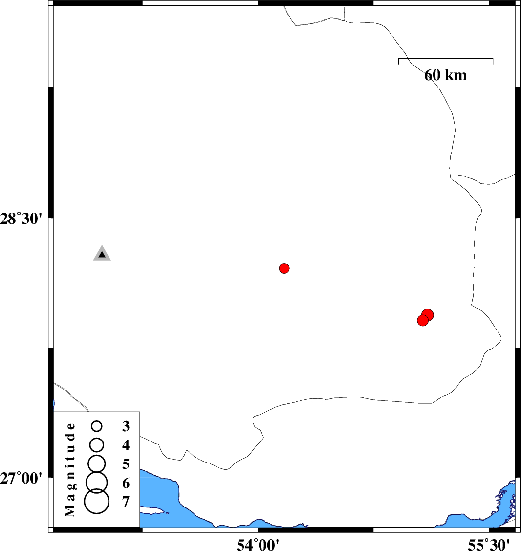 | 2010/06/07 | 00:57:33.2 | 05:27:33.2 | 27.94 | 55.1 | 18 | ML:3.5 | Fars Province, 80 km North-East of Lar |