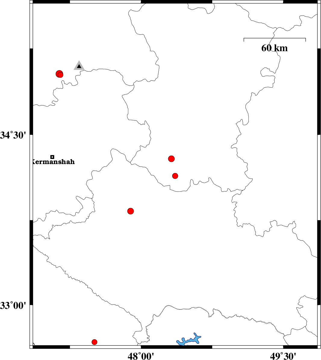 | 2010/06/14 | 20:03:17.3 | 00:33:17.3 | 33.83 | 47.89 | 15 | ML:2.9 | Lorestan Province, 29 km South of Nurabad | ||