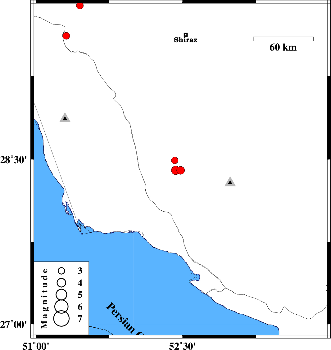 | 2010/06/08 | 10:21:08.4 | 14:51:08.4 | 29.61 | 51.31 | 15 | ML:3.3 | Fars Province, 34 km West of Kazerun | ||