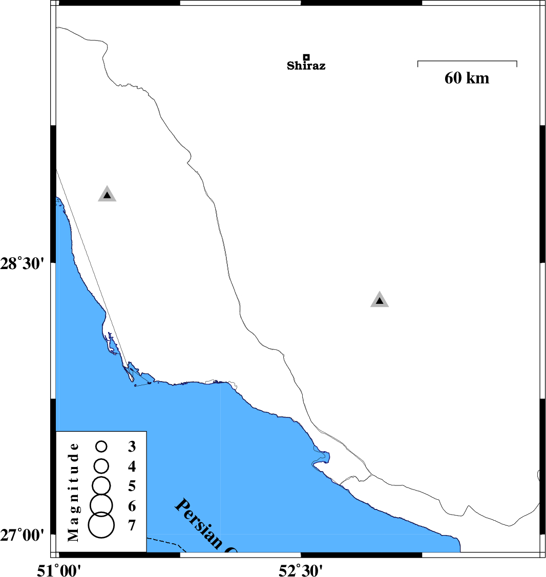 | 2010/06/17 | 22:22:13.9 | 02:52:13.9 | 28.4 | 52.48 | 10 | ML:3.7 | Fars Province, 48 km South-West of Firuz Abad |