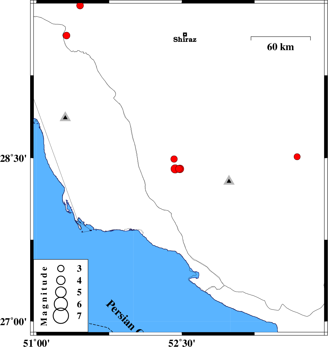 2010/06/08 | 10:21:08.4 | 14:51:08.4 | 29.61 | 51.31 | 15 | ML:3.3 | Fars Province, 34 km West of Kazerun | ||