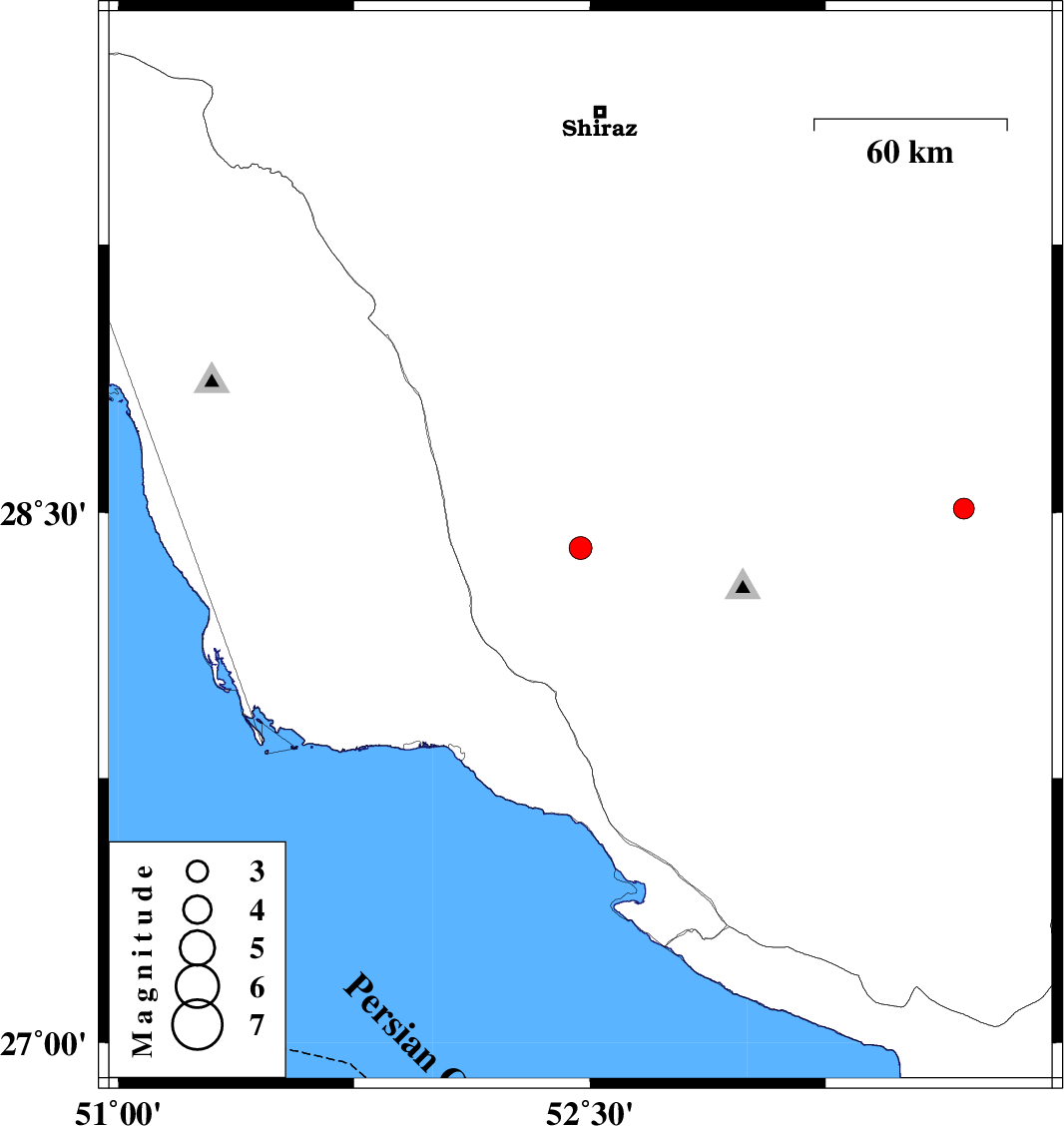 2010/06/27 | 18:38:57.4 | 23:08:57.4 | 28.4 | 52.47 | 2 | ML:3.2 | Fars Province, 48 km South-West of Firuz Abad | ||