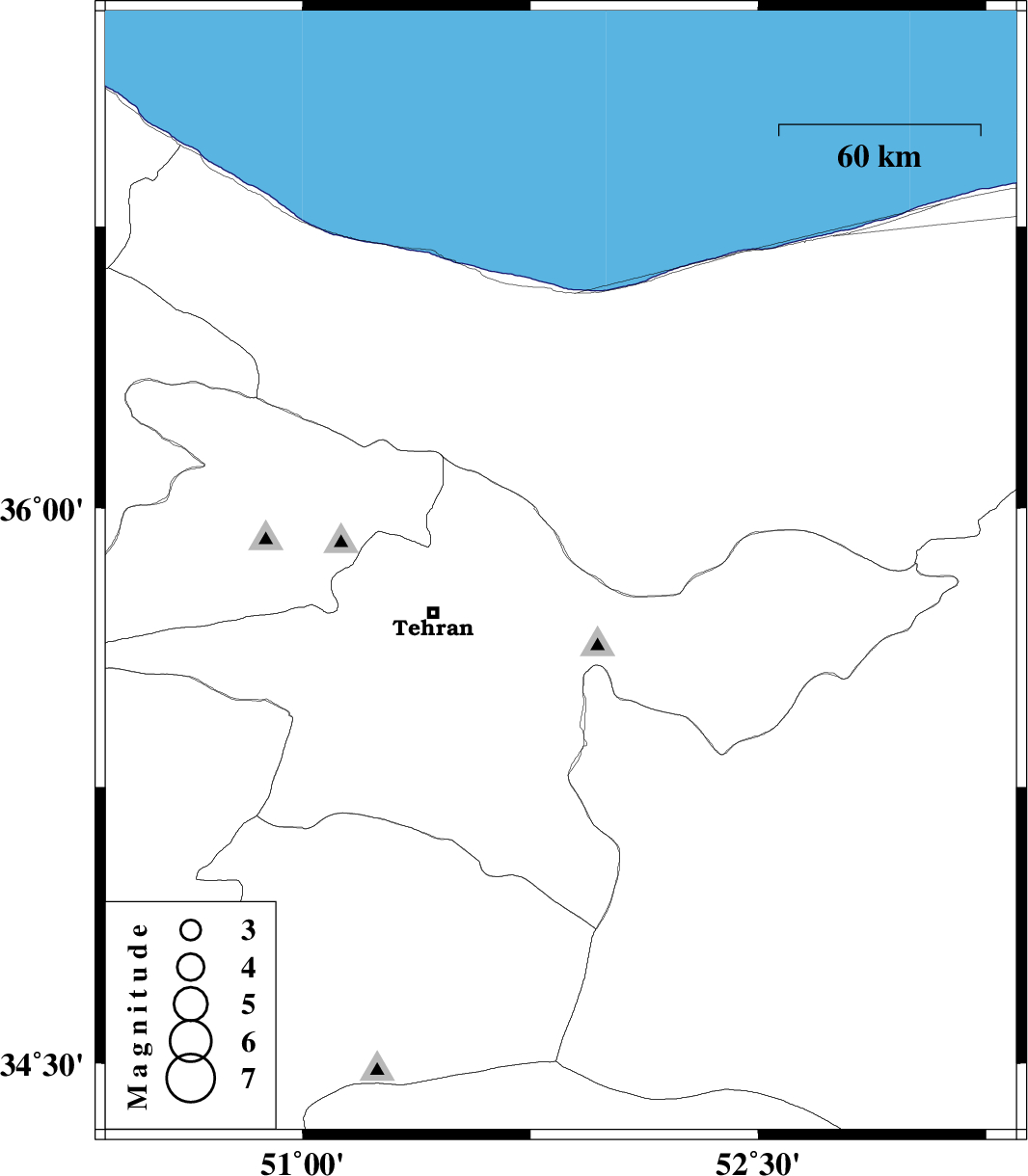 | 2010/06/29 | 02:04:19.2 | 06:34:19.2 | 35.82 | 51.85 | 11 | ML:2.5 | Tehran Province, 23 km North-West of Damavand |