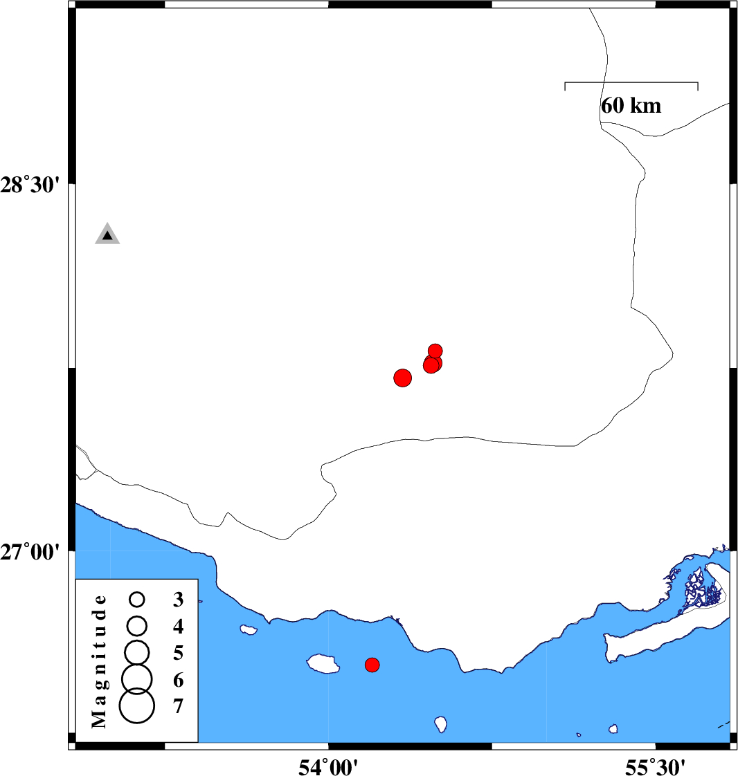 | 2010/06/22 | 01:07:12.4 | 05:37:12.4 | 27.77 | 54.48 | 15 | ML:3.6 | Fars Province, 17 km East of Lar |