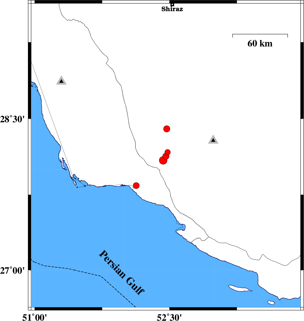 | 2010/07/03 | 08:50:40.3 | 13:20:40.3 | 27.84 | 52.13 | 14 | ML:3.1 | Bushehr Province, 7 km Bandar-e kangan | ||